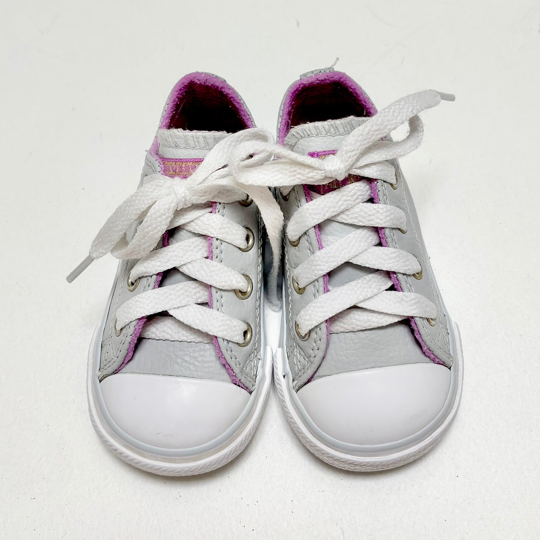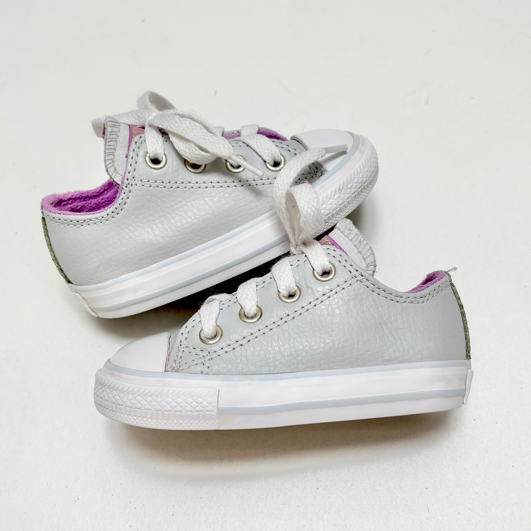 Pale grey synthetic lace-up sneakers with lilac trim.
