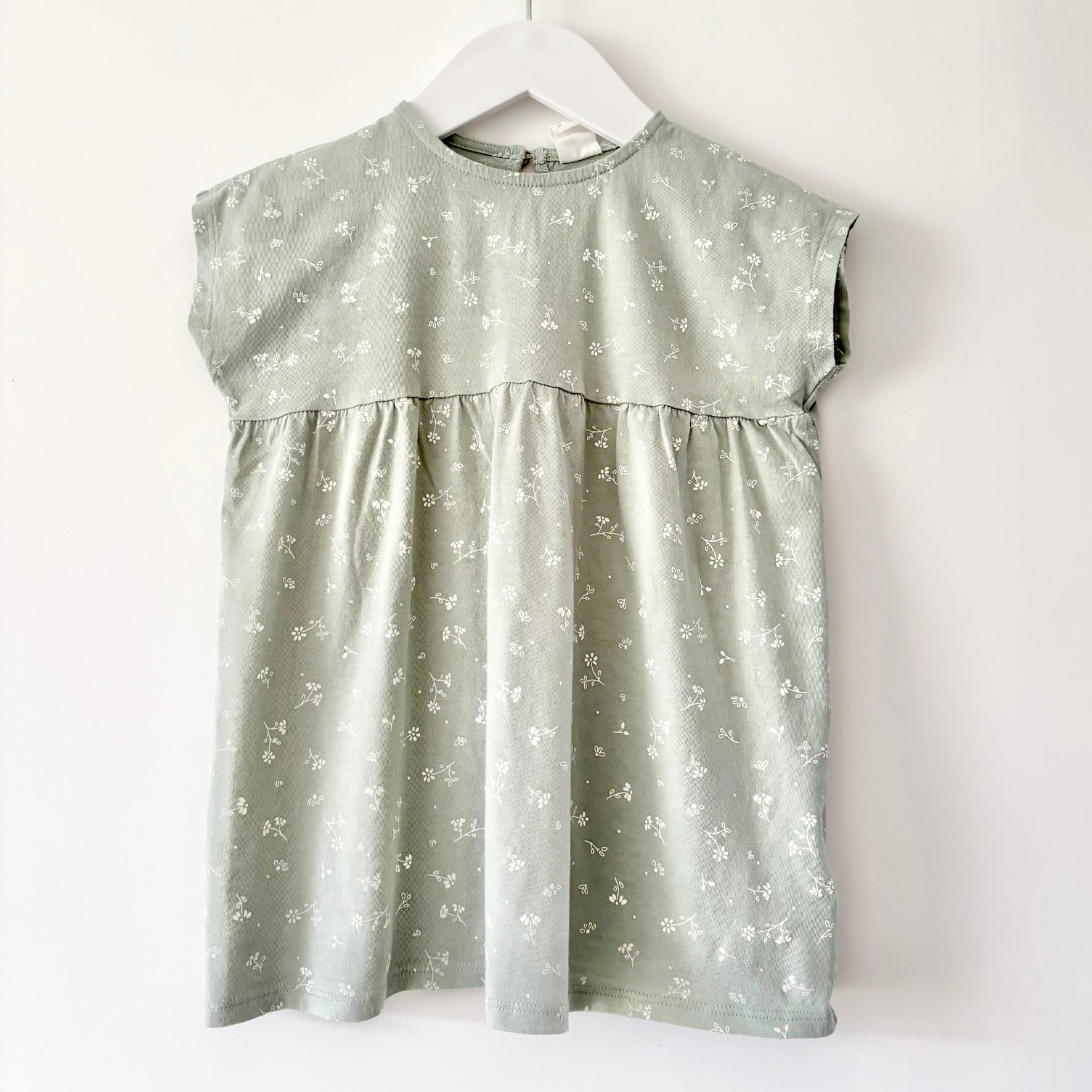 Sage green t-shirt dress with white floral pattern.