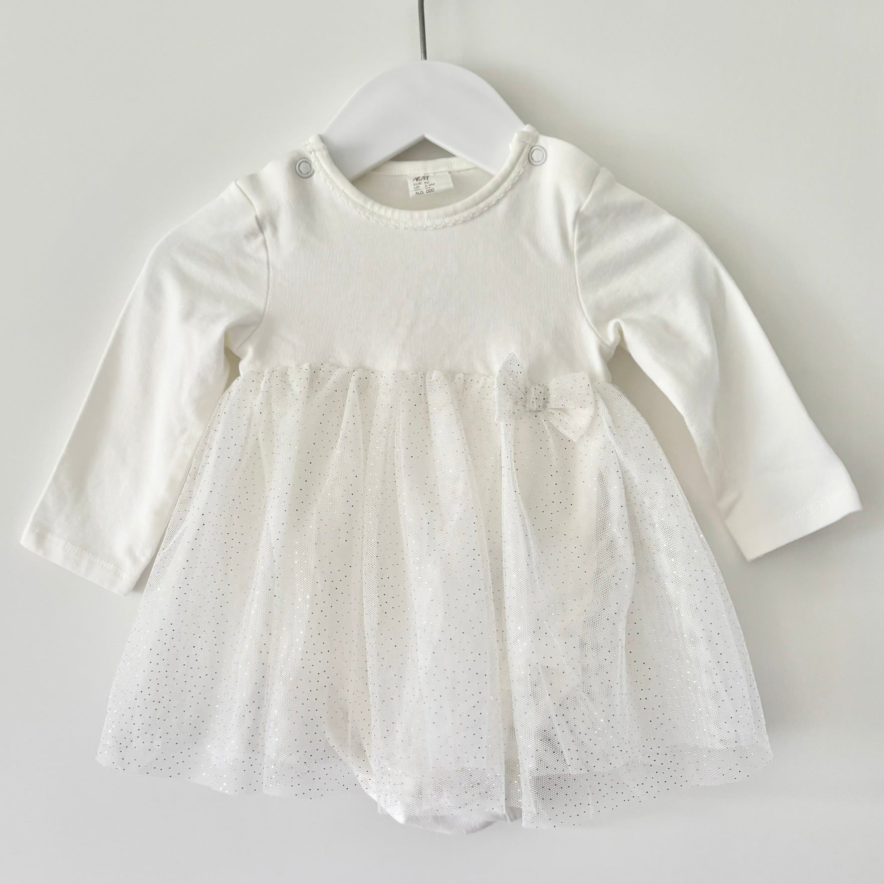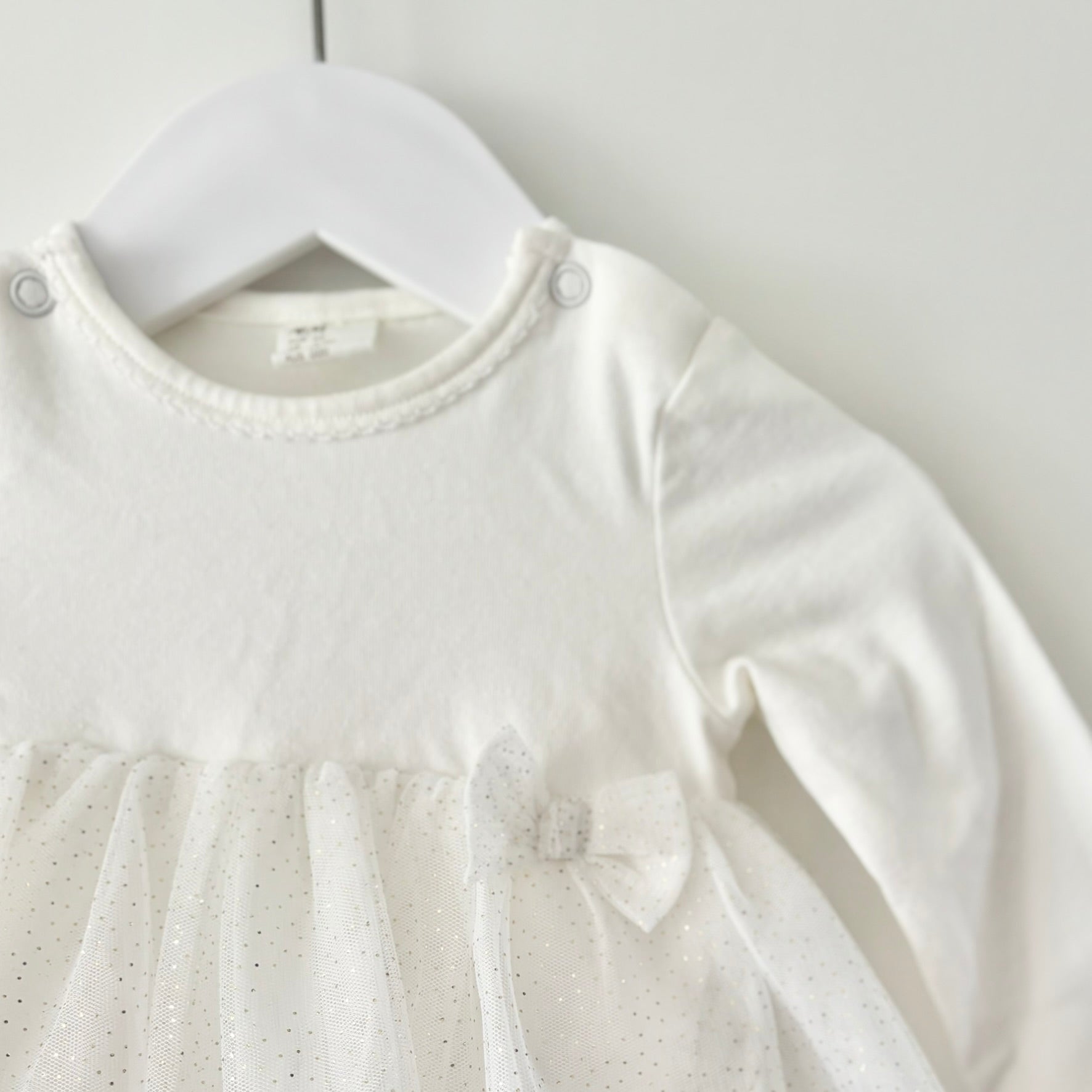 White long-sleeve bodysuit with sparkly tulle tutu skirt.