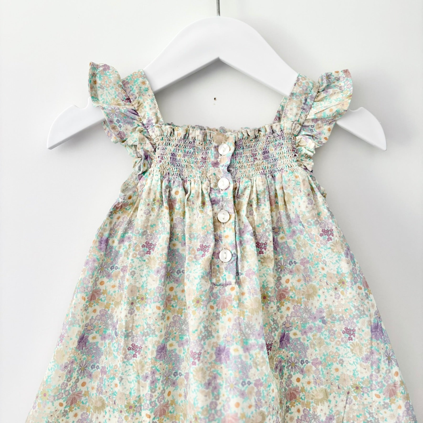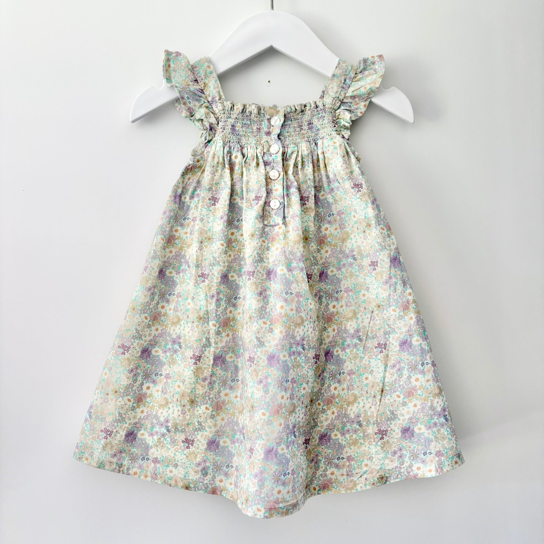 Frill-sleeve dress in pastel "Mayflower Floral."
