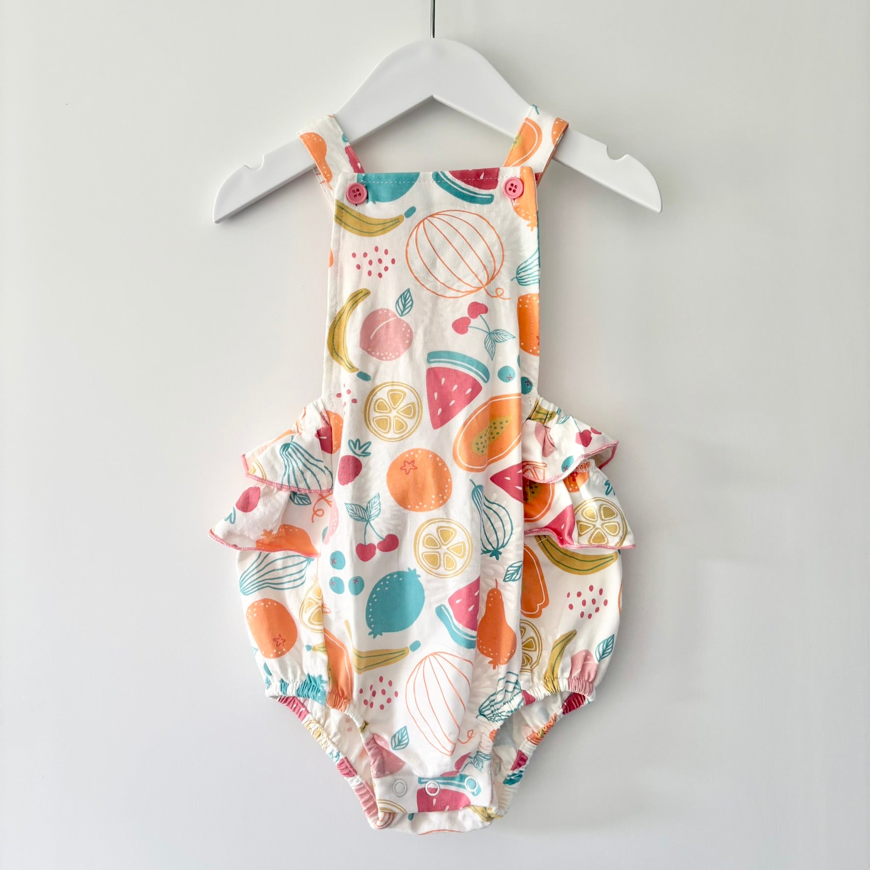 White frill romper with summer fruity pattern.